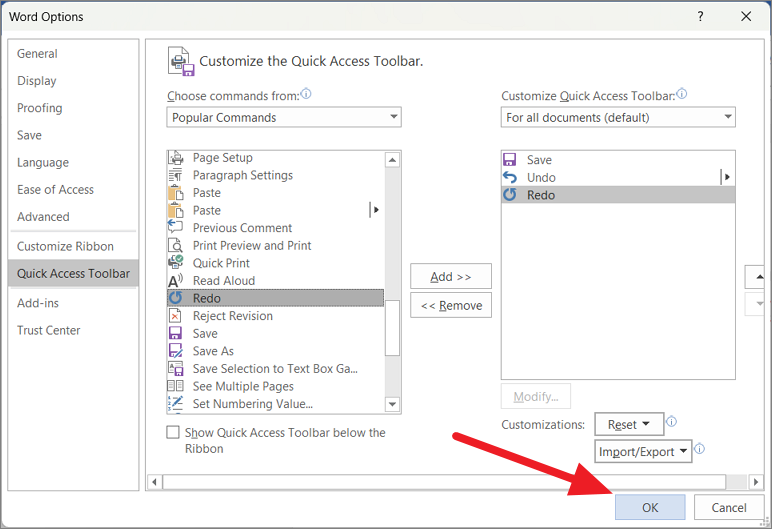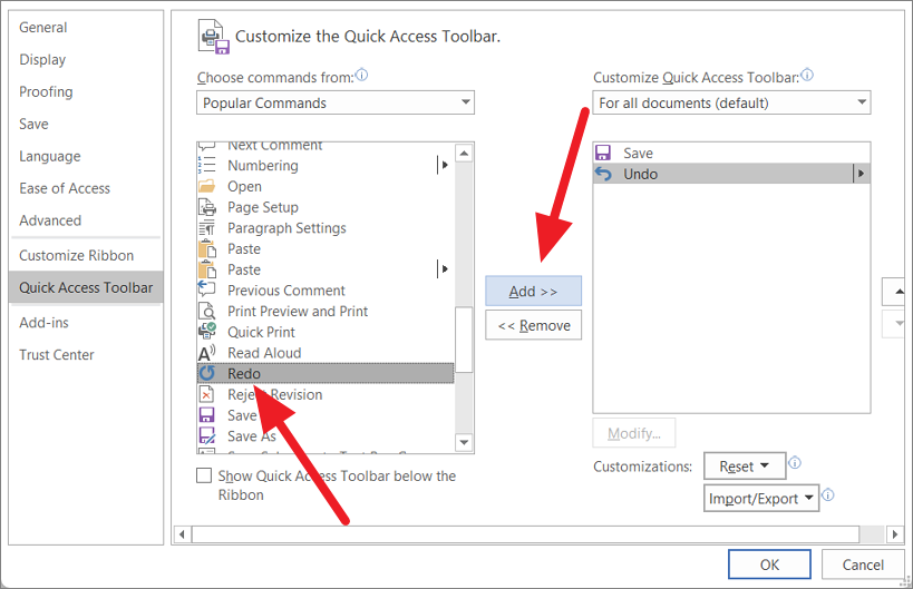 Step 5: Repeat the process for the 'Redo' command by selecting it and clicking 'Add >>'.