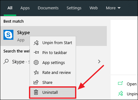 Step 2: In the search results, right-click on the app and select Uninstall from the context menu.