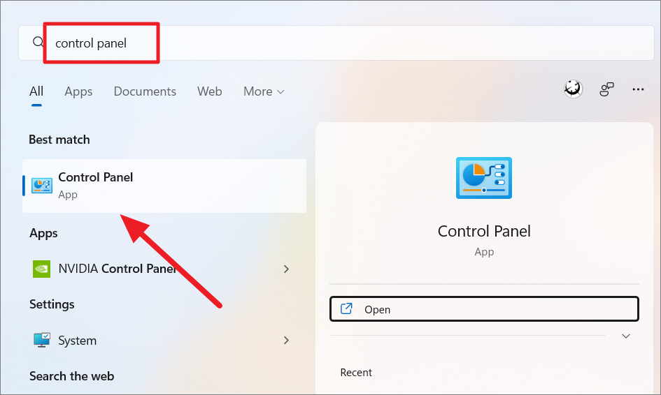 Step 1: Open the Start menu and search for Control Panel. Click on it in the search results to open.