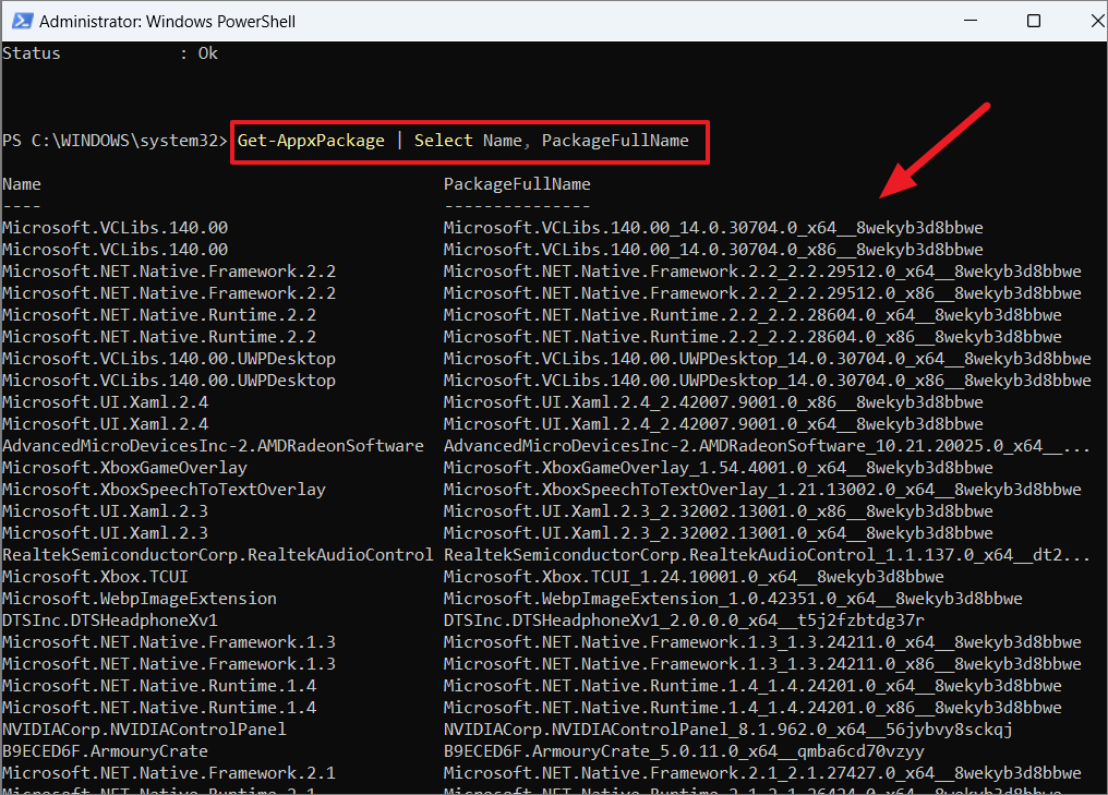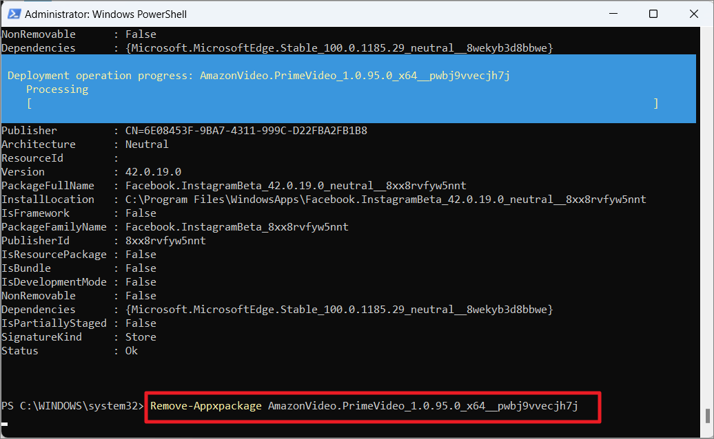 Step 4: Copy the PackageFullName of the app. Then, to uninstall it, run the following command: