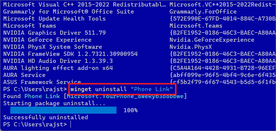 winget uninstall --name "App Name"Replace "App Name" with the exact name of the app. Example: