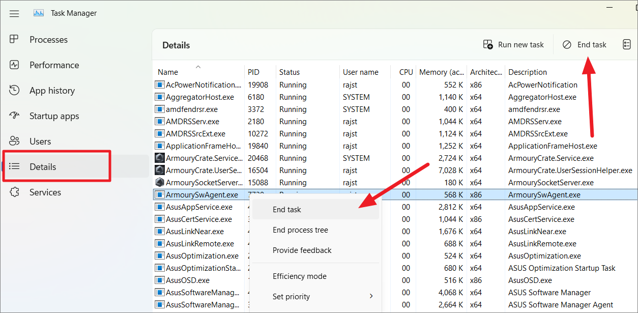 Step 2: Go to the Details tab. Find any processes related to the app you're trying to uninstall. Select them and click End task.