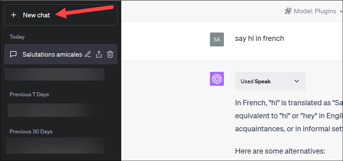 In case you were already logged in, you'll need to start a new chat to access the Plugins menu. On the left-hand side, you're going to see a few options; click on the 'New Chat' button.