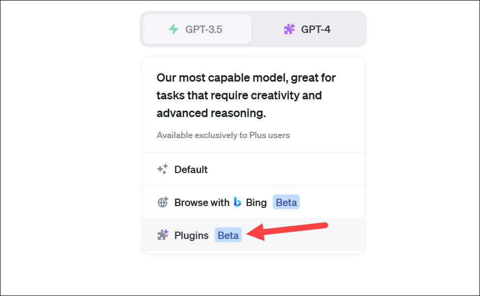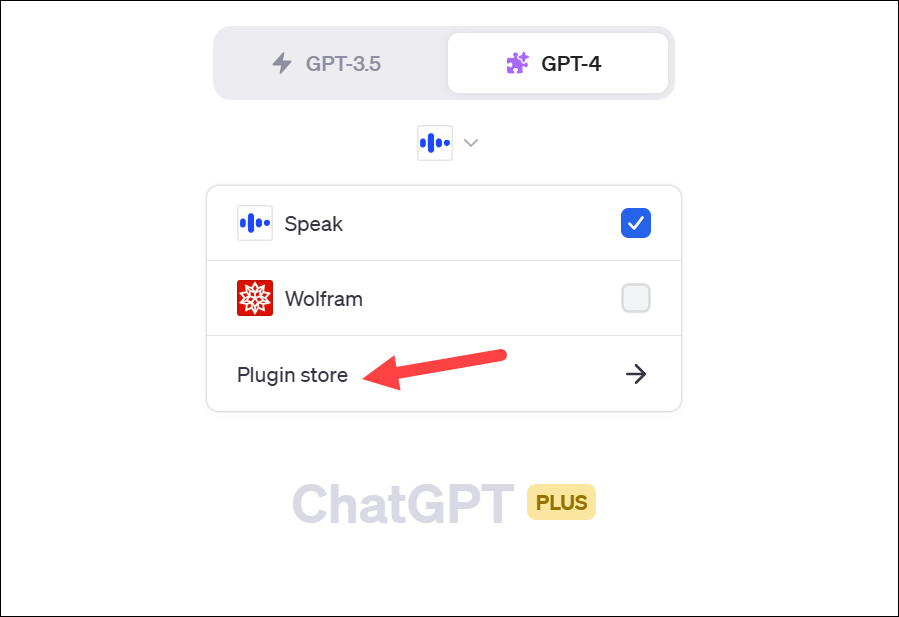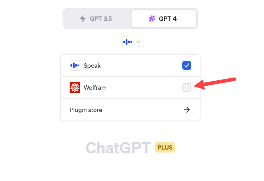 The model will switch to GPT-4 with Plugins. The Plugins you have enabled will be visible underneath. Click on it to expand the drop-down menu.