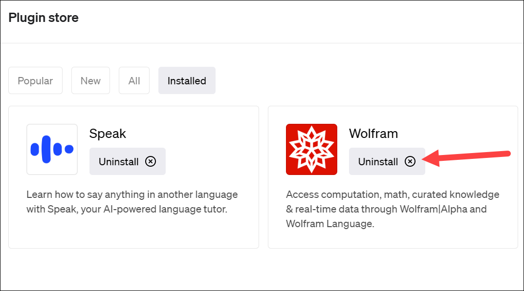 This is where all the Plugins for ChatGPT are hanging out, chilling, waiting for you to install them, or, in this case, uninstall them. Switch to the 'Installed' tab.