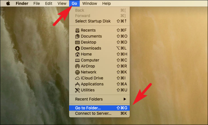 After that, click on the ‘Go’ tab present in the menu bar to reveal an overflow menu. Next, locate and click on the ‘Go to Folder’ option to continue. Alternatively, you can also press the Shift+Command+G keys together on your keyboard to open the window.