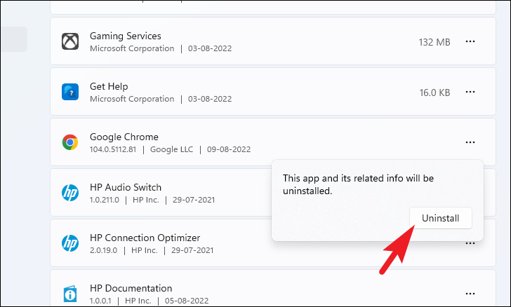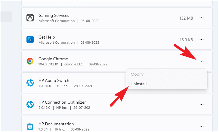 Step 5: Once you've found Google Chrome in the list, click on the three horizontal dots (ellipsis) next to it, and select Uninstall from the dropdown menu.