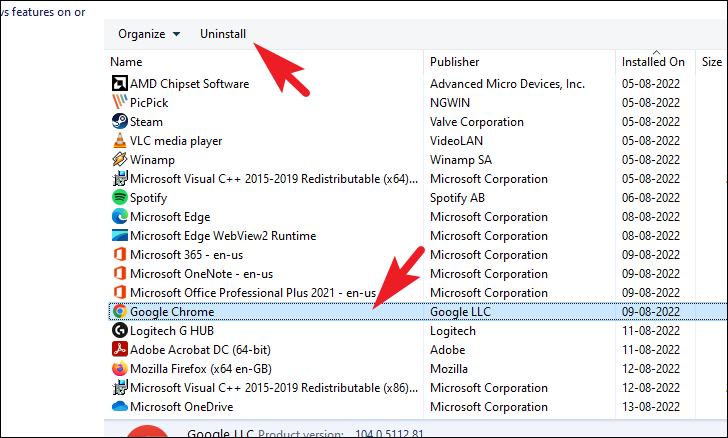 Step 4: Click on Google Chrome to select it, and then click on the Uninstall button at the top of the list. You can also right-click on Google Chrome and select Uninstall from the context menu.