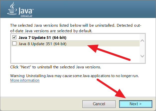 Step 4: The tool will display a list of installed Java versions. By default, outdated versions are selected. Choose the versions you wish to uninstall and click Next.