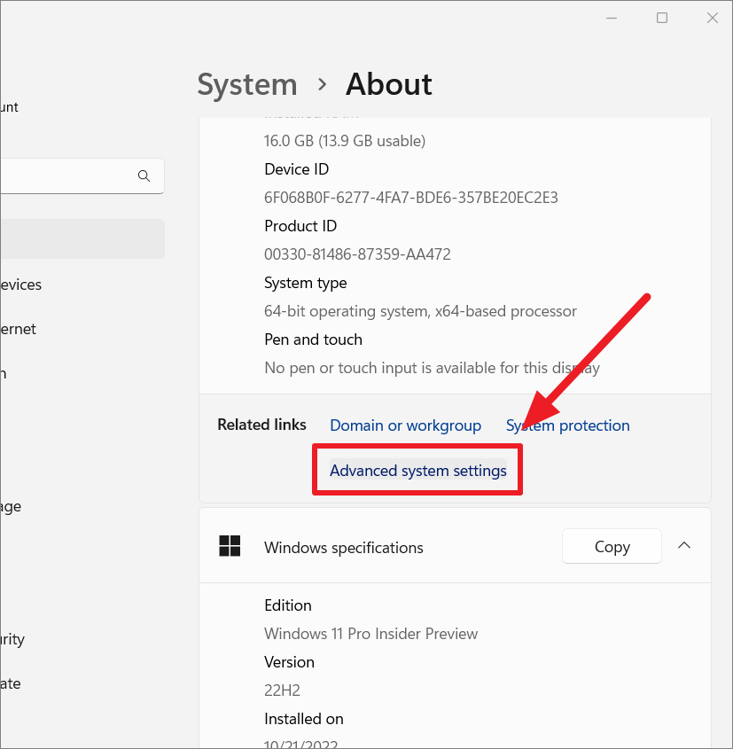 Step 2: In the About section, scroll down and click on Advanced system settings.