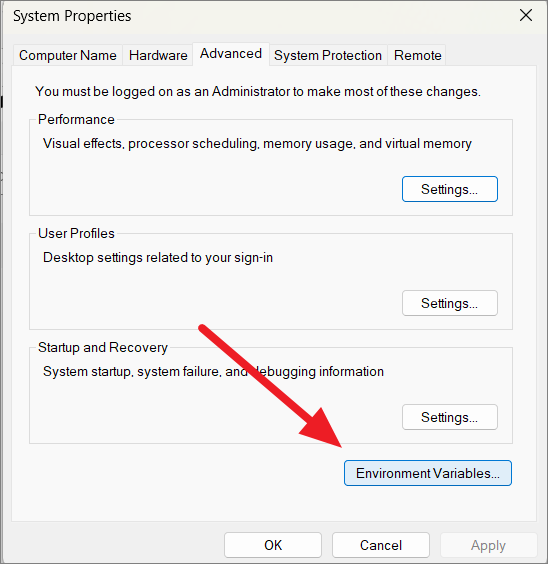 Step 3: In the System Properties window, under the Advanced tab, click on Environment Variables...
