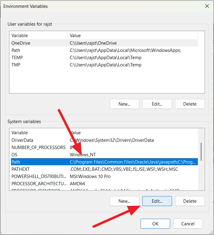 Step 4: In the Environment Variables window, under System variables, select Path and click Edit.