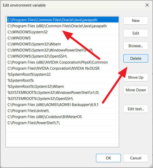 Step 5: Identify any paths related to Java. Select each Java-related path and click Delete to remove them.