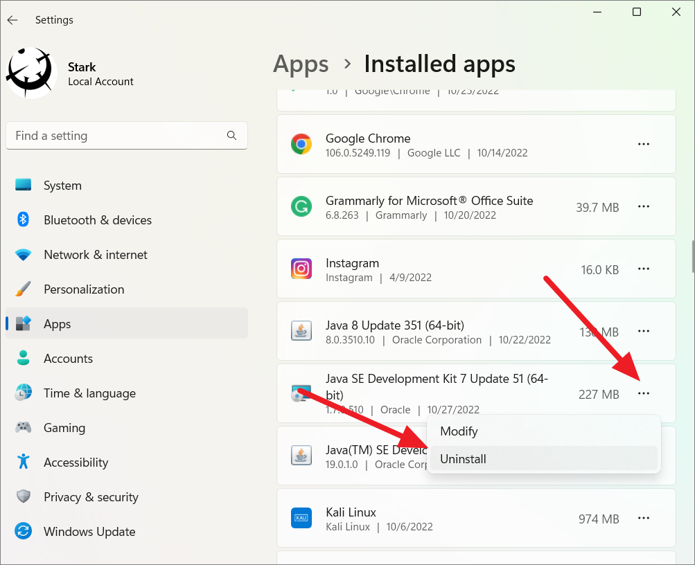 Step 2: Click on Installed apps on the right. Find the Java Development Kit from the list, click the three-dot icon next to it, and select Uninstall. Confirm by clicking Uninstall again and follow any additional prompts.