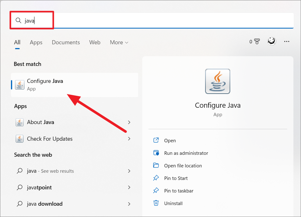 Step 1: Open the Start menu, search for Java, and select Configure Java from the search results.