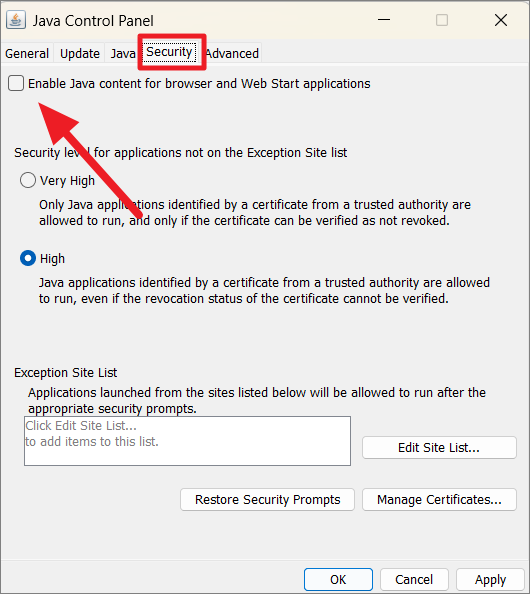 Step 2: In the Java Control Panel, navigate to the Security tab. Uncheck the box next to Enable Java content for browser and Web Start applications. Click Apply, then OK to save the changes.