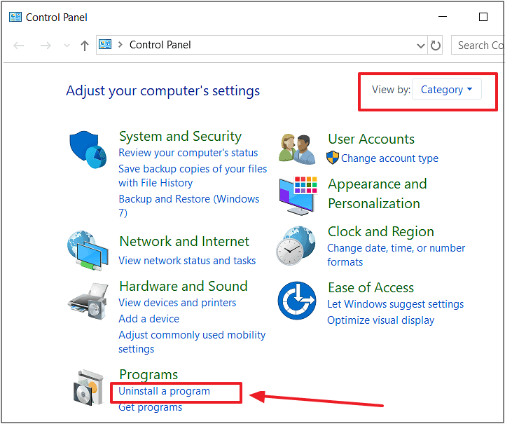 Select ‘Uninstall a program’ option under Programs category in Control Panel.