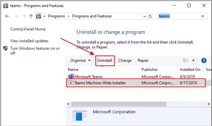 Search for ‘Teams’ in the search box. You will see both the ‘Microsoft Teams’ app and the ‘Teams Machine-wide installer’. First, click on ‘Teams Machine-wide installer’ app and then the ‘Uninstall’ in the toolbar to remove the software from your PC.