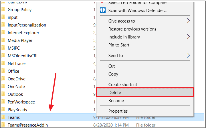 This will list all the Microsoft apps installed on your system. Scroll down until you find the Teams folder. Then, right-click on the Teams folder and select the ‘Delete’ option.