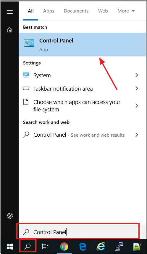 Open the Start menu or click on the ‘Search’ button present on the bottom left of the Windows taskbar and type ‘Control Panel’. Then, click on the ‘Control Panel’ app from the results.