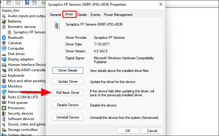 - In the Properties window, switch to the Driver tab. Click on the Roll Back Driver button.