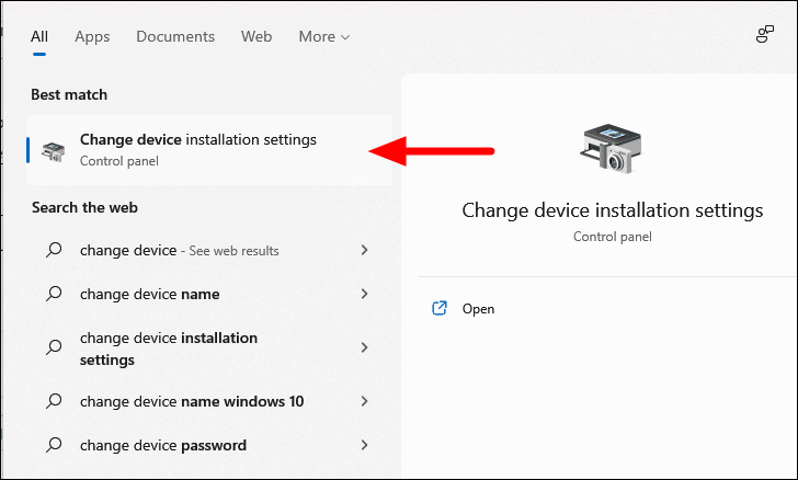 - Press Windows + S to open the Search menu. Type Change device installation settings into the search bar and select it from the results.
