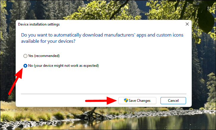 - In the Device installation settings window, choose the No (your device might not work as expected) option.