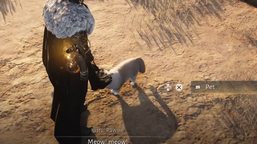 Step 1: Travel to Squarewall Hold in Jade Gate Pass, Hexi. Look for a tower southwest of the main area — Pawsie, a small kitten, sits at its base.