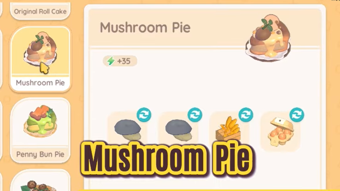 The first time you cook Mushroom Pie, the game records the base recipe in your gourmet collection regardless of which mushroom type you used. After that, you can create several variant recipes by sticking to a single mushroom type per pie. Using only Oyster Mushrooms, only Shiitake, only Button Mushrooms, and so on will each unlock their corresponding “<mushroom name> Pie” variant.
