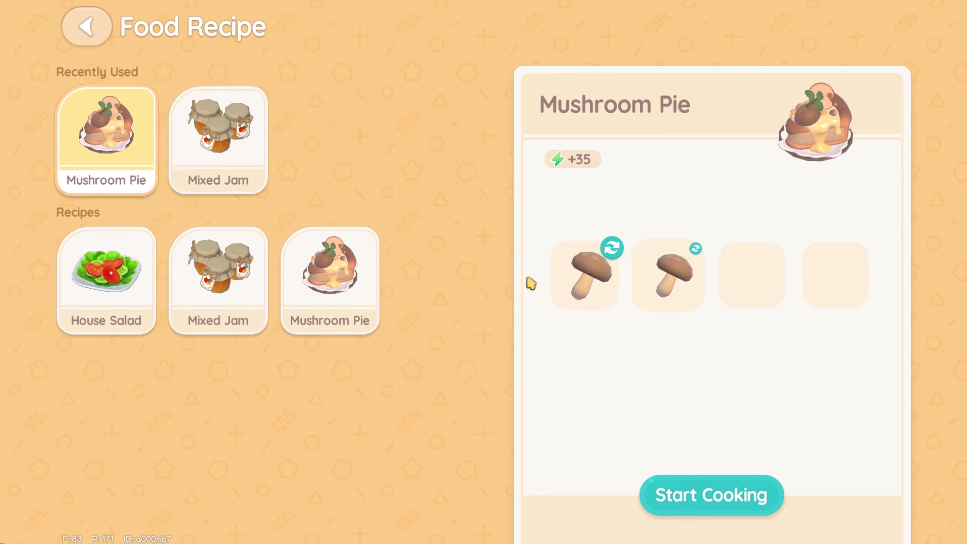 Within the cooking system, recipe variants such as the different mushroom pies are valuable because each counts as a separate discovery and grants extra experience. When ingredients are cheap and easy to harvest—like common mushrooms and home-grown wheat—using them for variants is a reliable way to push the Cooking meter without relying only on Massimo’s purchased recipes.