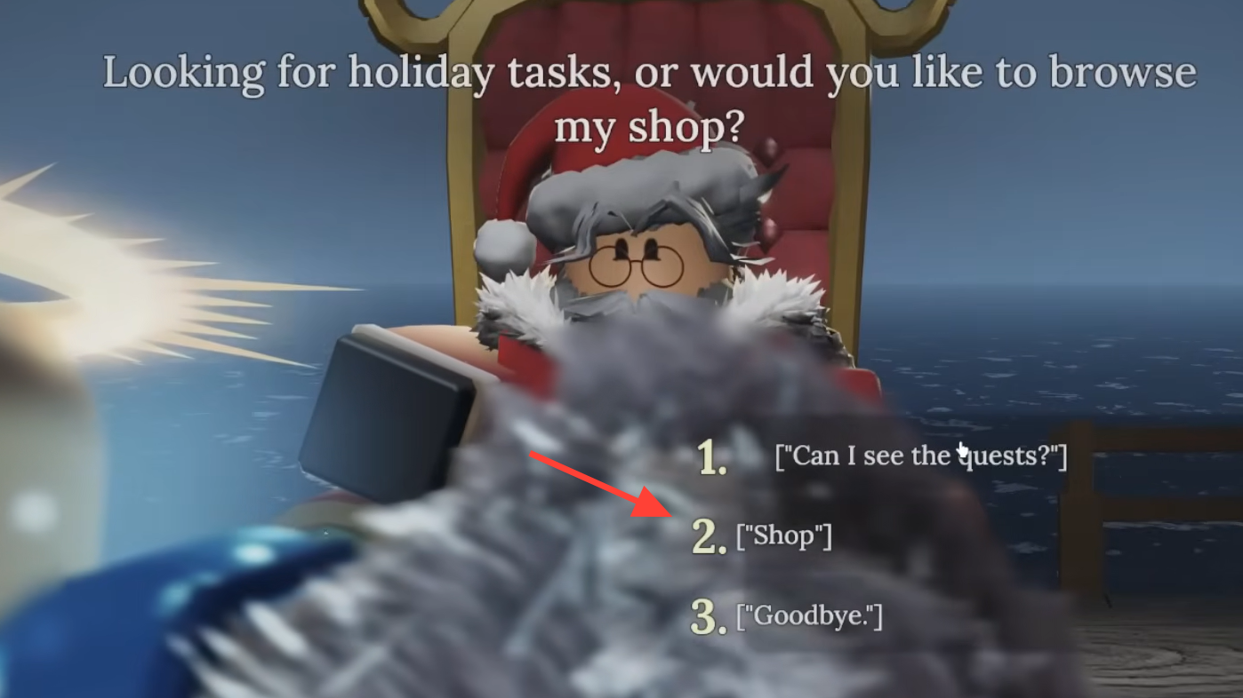 Step 3: Walk up to Santa and interact with him. You’ll see a dialogue with options, including a “Shop” option and access to special Holiday Tasks.