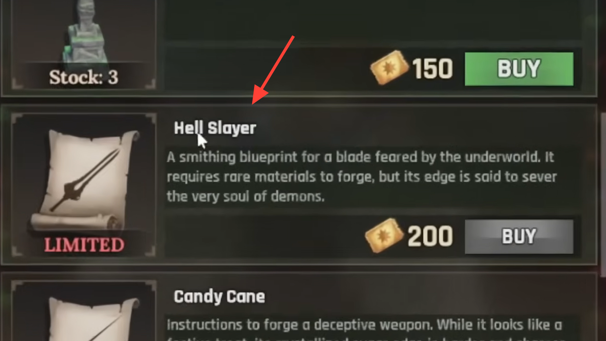 Step 2: Scroll through the Christmas Store inventory until you find the Hell Slayer listing, identified as a limited Straight Sword blueprint with the flavor text about being feared by the underworld.