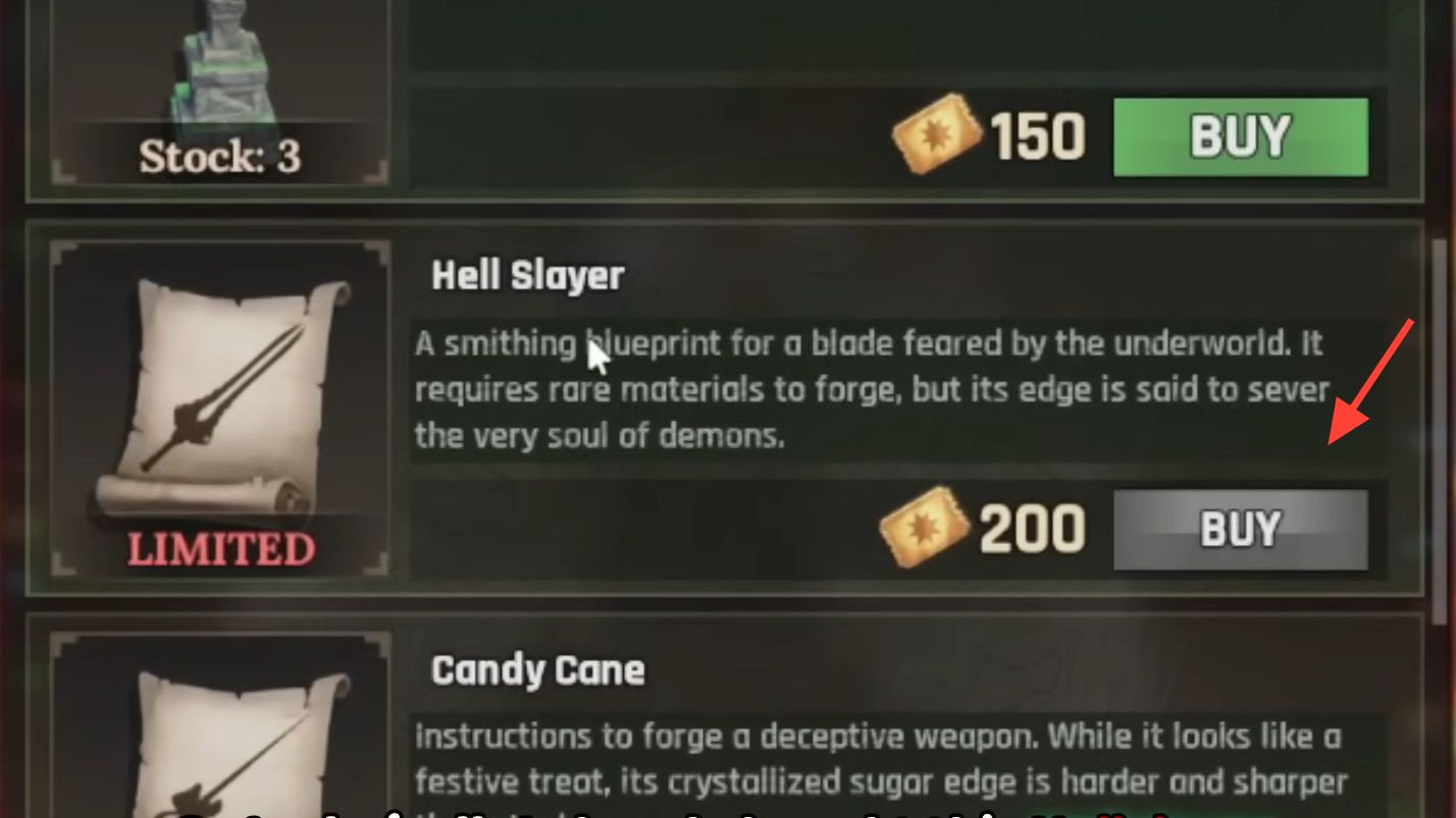 Step 3: Confirm the purchase. Your Xmas Tickets are deducted, and the Hell Slayer recipe is instantly added to your forge’s Straight Sword list.