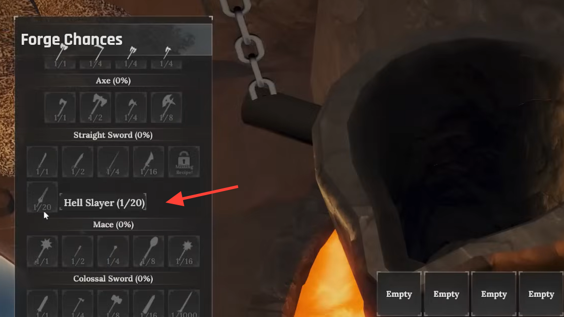 Once the blueprint is unlocked, Hell Slayer appears under the Straight Sword category in your forge menu as one of the possible results. It does not bypass normal crafting logic. You still forge a Straight Sword with ores and stats, and the game then rolls which specific variant you get. For Hell Slayer, that roll is a 1-in-20 chance.