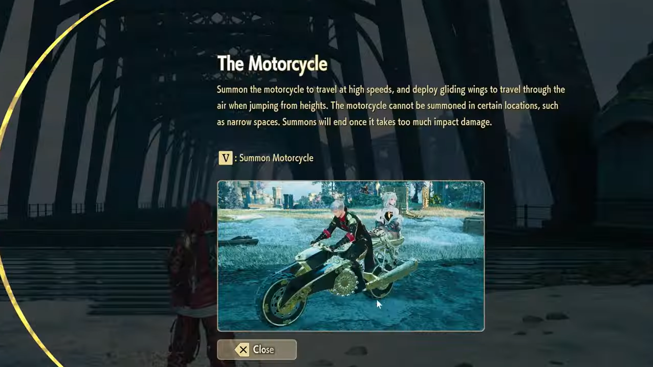 Once unlocked, summon the motorcycle by pressing V on PC or R1 + Left D-Pad on console. You can only call it in designated Motorcycle Zones, marked by a motorcycle icon in the bottom left of your screen. If that icon appears crossed out, the area is a non-Motorcycle zone—typically dungeons and tight interior spaces where the bike cannot fit.