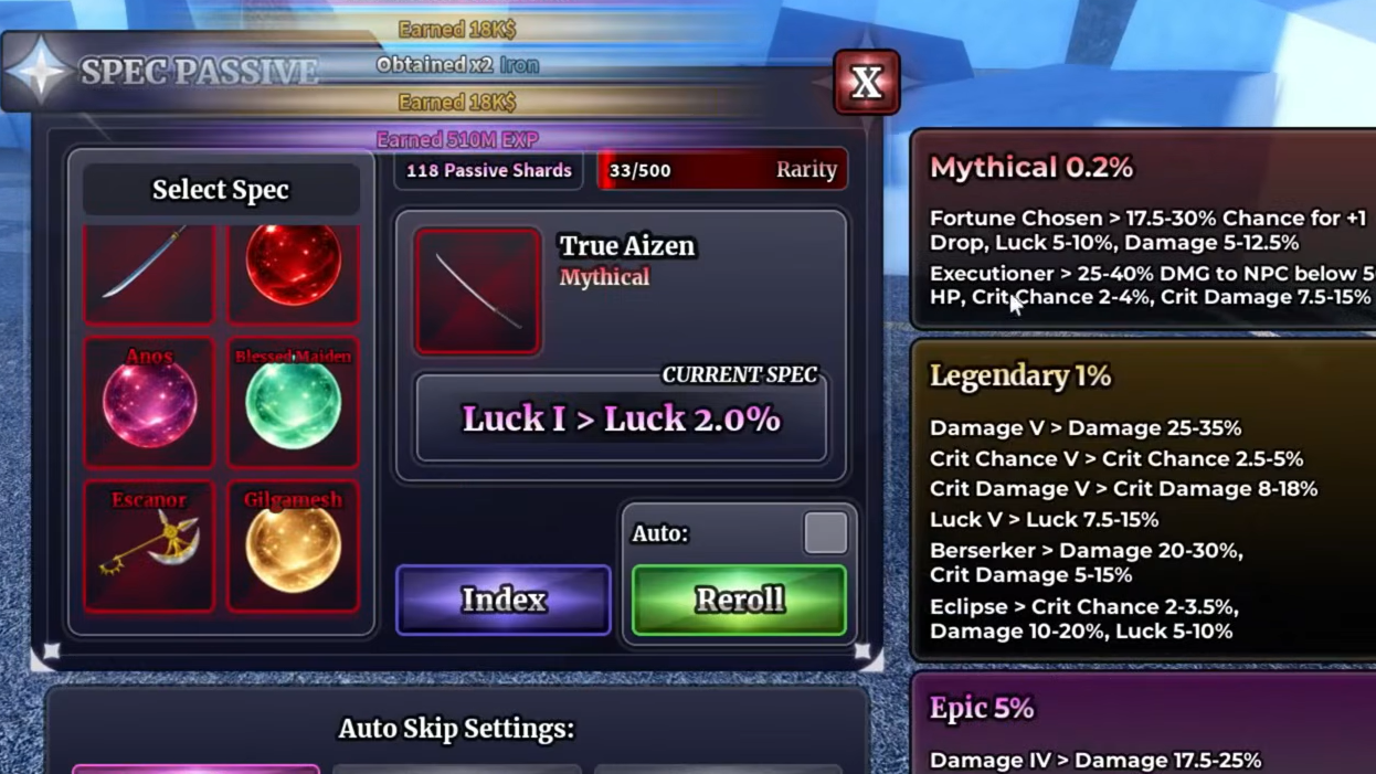 Spec Passives are a late-game system by design — the Level 10,000 gate and low shard drop rates ensure that. But once you start rolling, even a mid-tier passive like Damage IV makes a noticeable difference in clear speed. The real payoff comes when you land a Mythical or a strong Legendary on your main weapon, turning an already powerful Sword or Melee Spec into something significantly more effective across boss fights, NPC farming, and everything in between.