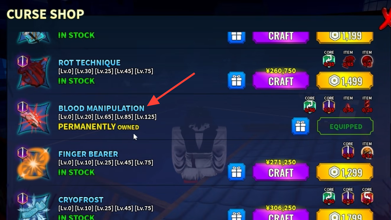 After purchasing, Blood Manipulation will appear in your equipped Cursed Technique slot. You can verify it's active by checking your skill bar — Slicing Storm should be immediately available at Mastery Level 0. If the technique doesn't appear, re-open the Permanent Cursed Techniques tab in the shop and confirm the transaction completed. Make sure you have all four resource types in sufficient quantities before attempting the purchase, as the game won't process a partial buy.