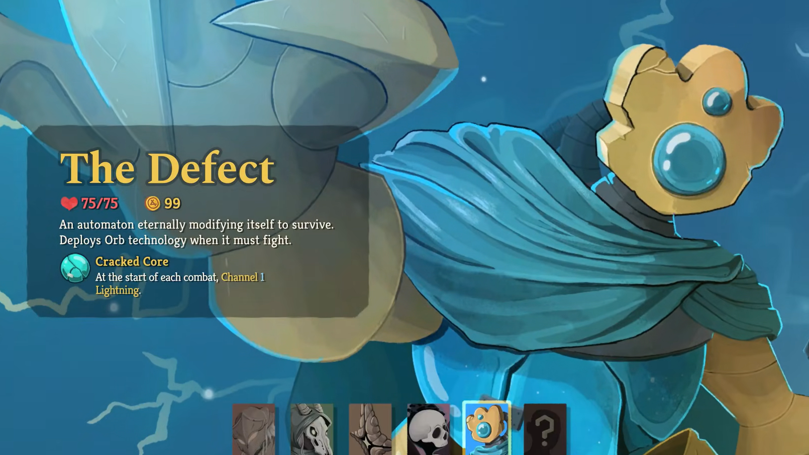 Returning from the original Slay the Spire, the Defect is an automaton that fights using Orbs. It starts with 3 Orb slots, one of which is automatically filled with a Lightning Orb by Cracked Core. Channeled Orbs provide passive effects at the end of each turn, and Evoking them triggers a stronger one-time effect.