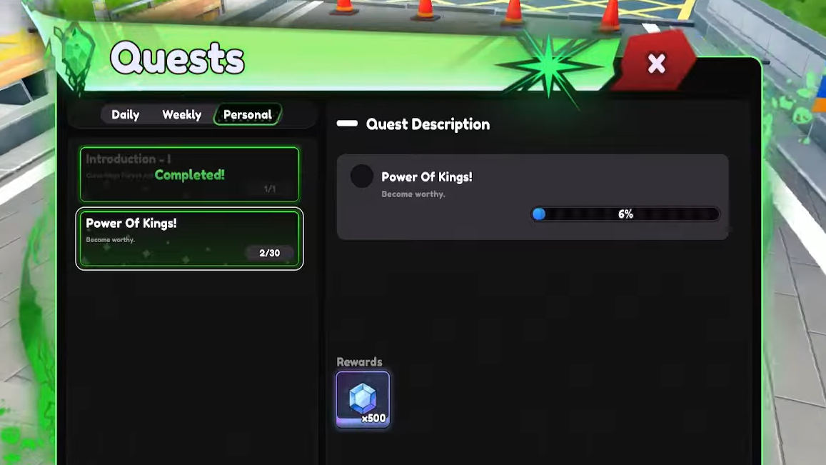 Step 2: Open the Quest tab in the lobby, go to your Personal quests, and claim the one called Power of Kings. The objective will tell you to find a distressed NPC.