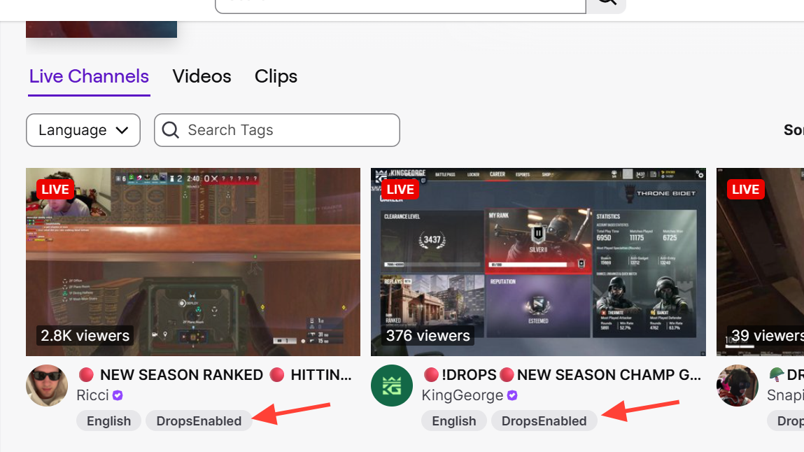 Step 1: On Twitch, search for Rainbow Six Siege X and filter for streams marked with the “Drops Enabled” tag. Open any participating channel.