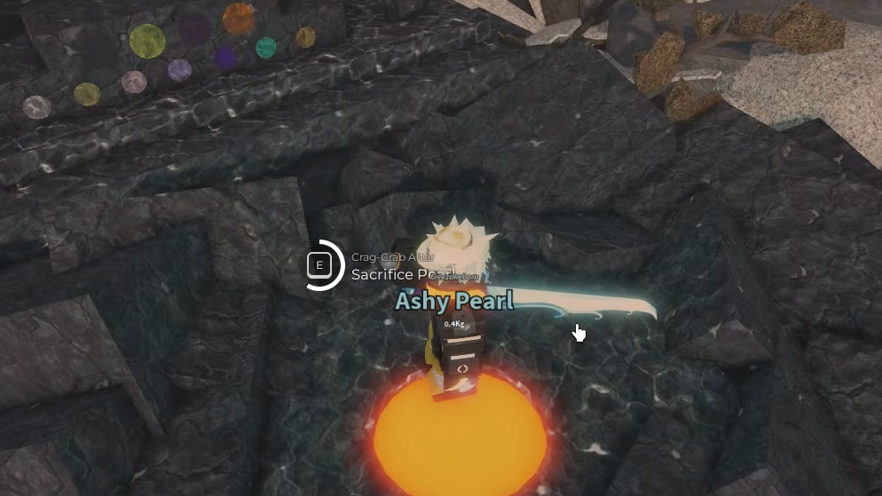 Approach the altar and equip each pearl one by one. Stand in front of the structure and press the interact key (E) to sacrifice them. As you place each pearl, a corresponding light will illuminate under the crab statue. You must sacrifice all 11 variants to proceed.