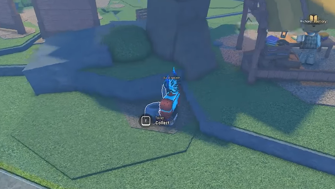 Richard, the Bestiary NPC, wears a cowboy hat and glasses. He stands near a large tree in the central hub. Walk behind the tree directly next to his book stand. The Toilet is a blue fixture with the seat up, partially buried in the ground.