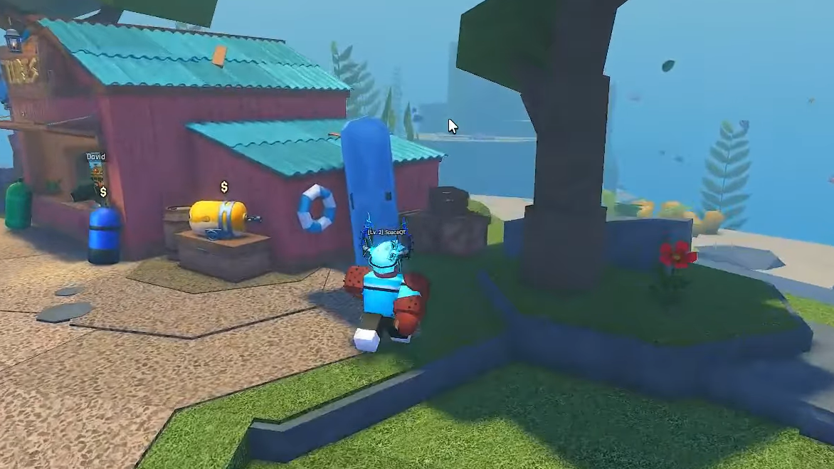 David runs the Tube shop in the central hub. Walk to the right side of his shop building. The Door is a large blue panel leaning against the wall, positioned just behind the Pufferfish Tube display and next to a blue-and-white lifebuoy.