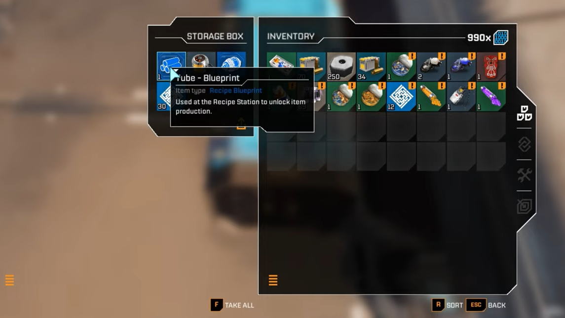 Step 4: Interact with the blue box to loot it. This is where you obtain the Tube Blueprint. In many cases, you will also see a Rotor Blueprint in the same container, letting you unlock both components at once.