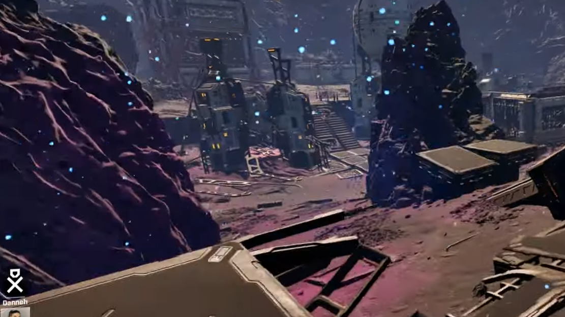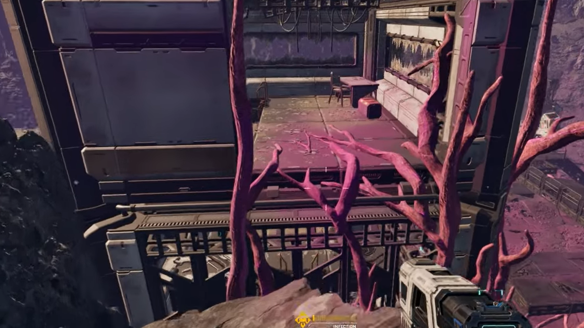 From the starting area, the landmark to look for is a large, broken satellite or dish-like structure that appears to be jammed into the side of a rocky mountain. The outpost is wrapped around that slope, with multiple buildings, shattered equipment, and purple or pink organic growths spreading across the site.