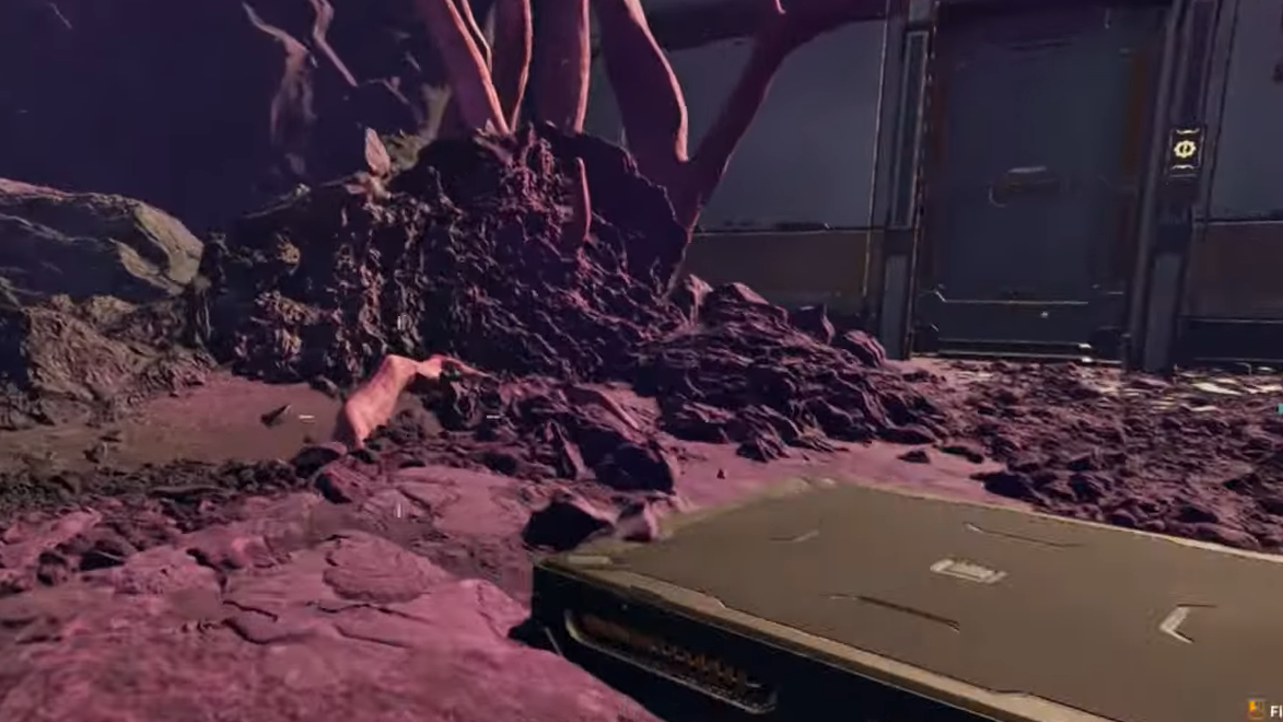 The building that holds the blueprint is easy to recognize once you are in the middle of the outpost. It is the largest structure on site and is draped in thick, pink root growths. Its main doors are either blocked or not directly accessible, so a straight walk-in does not work.