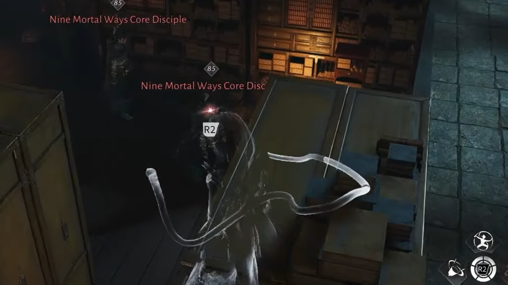 Step 8: Return to the previous area and enter the large room. Drop onto the nearest bookshelf, then use Celestial Seize to reach the third chest.