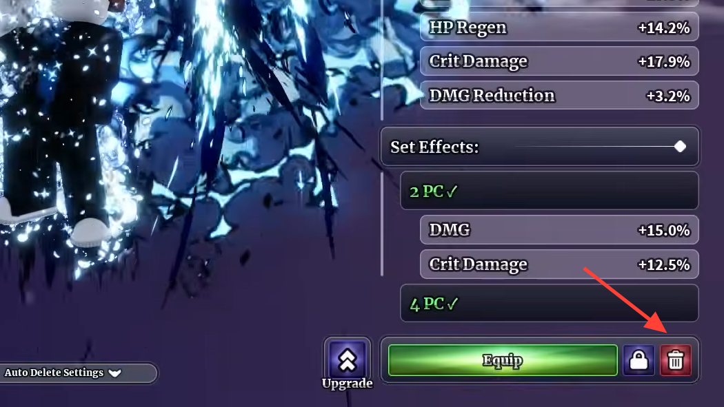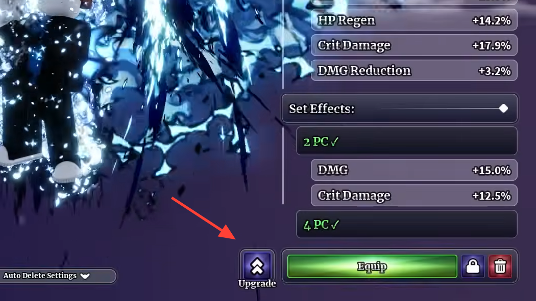 Step 2: Click the Upgrade button next to the Equip/Unequip button. A pop-up will appear with a "Use Dust" option.