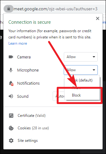 Step 2: A menu will appear displaying various site permissions. Find the 'Microphone' option. Click on the drop-down menu next to 'Microphone' and select 'Block' to temporarily block microphone access for Google Meet.