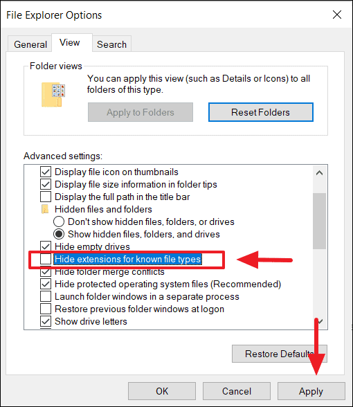 Step 2: In the File Explorer Options window, click on the View tab. Uncheck the box labeled Hide extensions for known file types. Click Apply, then OK to save the changes.